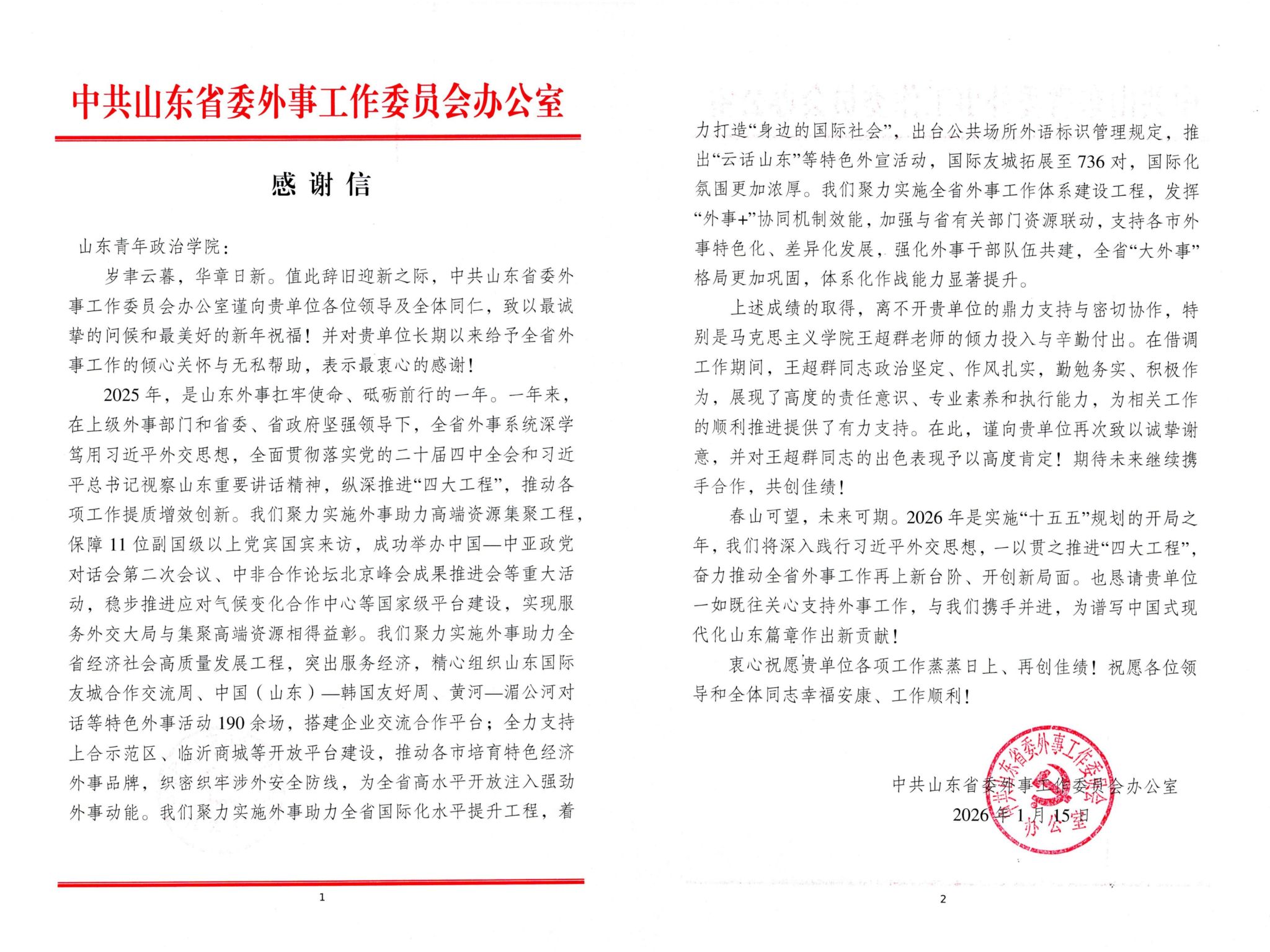 近日,学校收到来自中共山东省委外事工作委员会办公室(以下简称“省外办”)感谢信,信中对学校马...
