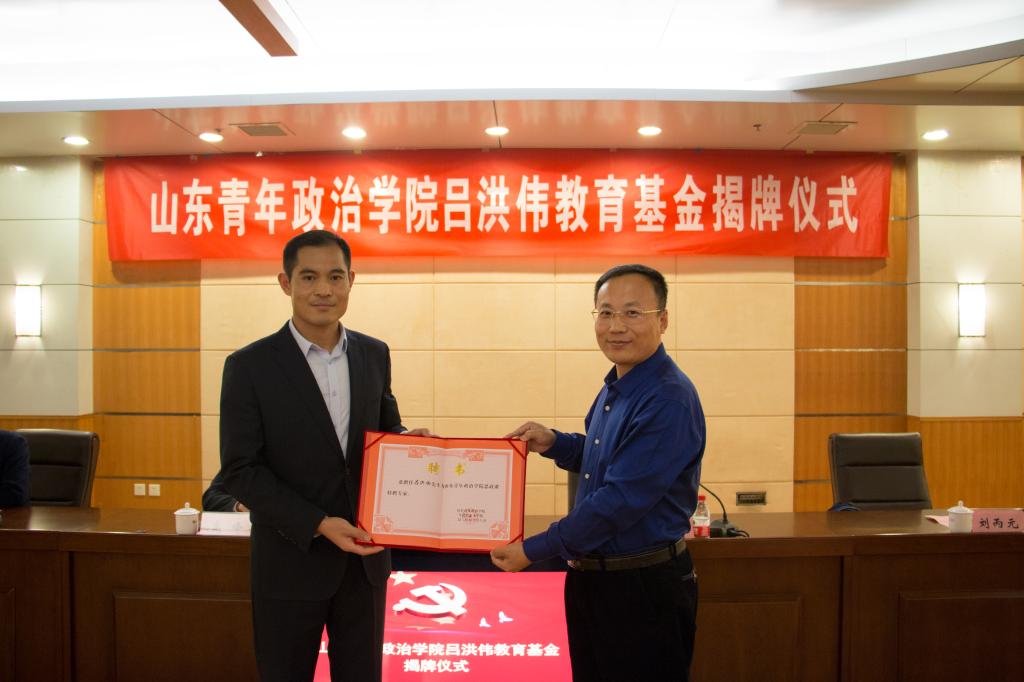 仪式上,学生工作部部长、山东青年政治学院教育发展基金会秘书长石瑞宝与原山东军义酒业、军义体育有限公司董事长、济南市历下区卫健局吕洪伟共同为“吕洪伟教育基金”揭牌,学院直属党支部书记温永慧宣读了《山东青年政治学院吕洪伟教育基金管理办法》,院长刘丙元为吕洪伟颁发了“山东青年政治学院思政课特聘专家”证书。吕洪伟在讲话中表示,贡献教育事业、帮助更多需要帮助学子是此次设立教育基金的初衷和目的。今后他将尽己所能支持学校教育事业发展,与学校和马克思主义学院共成长、同进步。