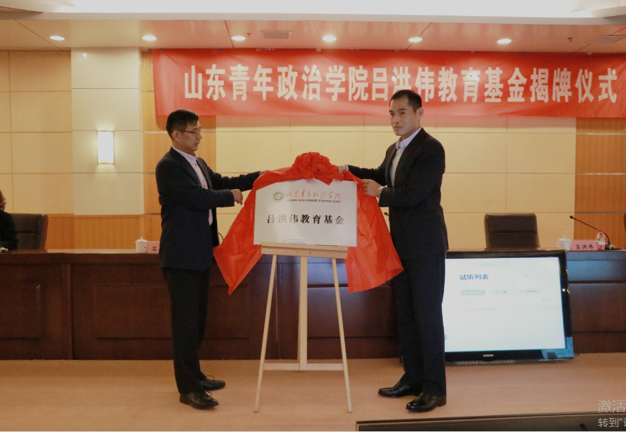 10月15日下午,山东青年政治学院吕洪伟教育基金揭牌仪式在我校成功举行。学校党委副书记、山东青年政治学院教育发展基金会理事长高峰出席揭牌仪式并讲话。原山东军义酒业、军义体育有限公司董事长、济南市历下区卫健局吕洪伟,学生工作部部长、山东青年政治学院教育发展基金会秘书长石瑞宝,马克思主义学院班子成员及全体师生参加了揭牌仪式。仪式由马克思主义学院直属党支部书记温永慧主持。