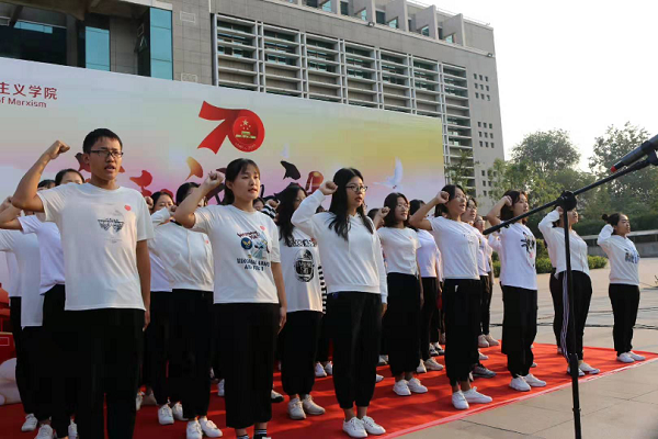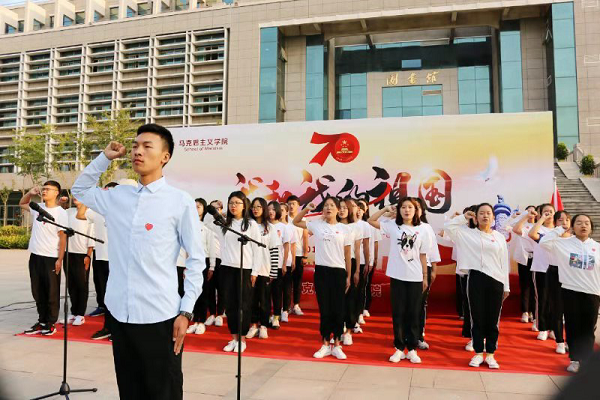 9月30日清晨,金风卷旗招,喜迎庆华诞。中华人民共和国成立70周年之际,马克思主义学院2019级全体学生放歌青春,礼赞祖国,隆重举行“我和我的祖国”主题升旗仪式,表达对祖国的祝福与热爱。学院有关领导、学工人员参加。