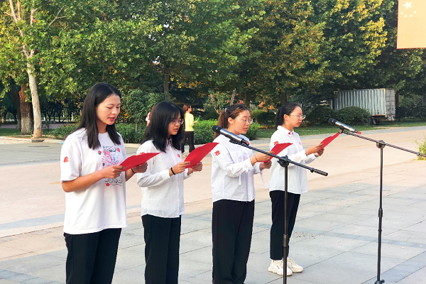 随后,马克思主义学院全体学生集体朗诵《我骄傲,我是中国人!》,国旗下回荡着激昂嘹亮的诗言——“黄土高原是我挺起的胸脯,黄河流水是我沸腾的血液,……当五大洲倾听东方声音的时候,我骄傲,我是中国人!”,令人为之震撼。马克思主义学院学生以青春之我熔铸青春之中国,体现了马院学生的责任担当。