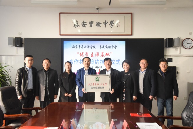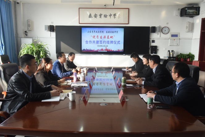 11月12日,马克思主义学院与泰安实验中学签署合作协议并举行优质生源基地挂牌仪式。学院院长刘丙元、副院长段微晓、教师马荣良、王显辉,泰安实验中学副校长夏法卫、副校长陈佳敏、行政后勤中心主任王德峰、课程教学中心主任董伟参加了签约挂牌仪式。