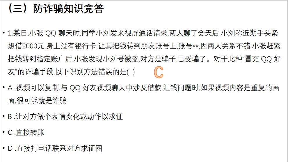 为增强同学们对安全知识的掌握,提高安全防范意识,马克思主义学院广泛动员,精心组织,开展“防诈骗”知识竞赛进校园。通过“防骗知识问答”,不断普及、及时掌握防骗常识,做到不轻信,不上当。此次活动的开展,揭开了电信诈骗的面纱,共筑了电信安全防线,使同学们能够有效应对突发的诈骗状况,保证自身权益不受侵害。
