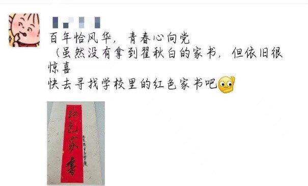 一封封红色家书,承载着书写人的真挚情感,承载着共产党员的集体革命情怀,承载着这个群体的集体价值追求。7月1日,马克思主义学院在全校范围内送出百封家书,校园的树干上、盆栽里……同学们纷纷找寻到了所有的家书,跟随家书重温红色记忆,让家书背后的真实故事与真挚情感得以再现,展现信仰的力量、党性的坚贞,将红色文化以喜闻乐见的方式传播出去。