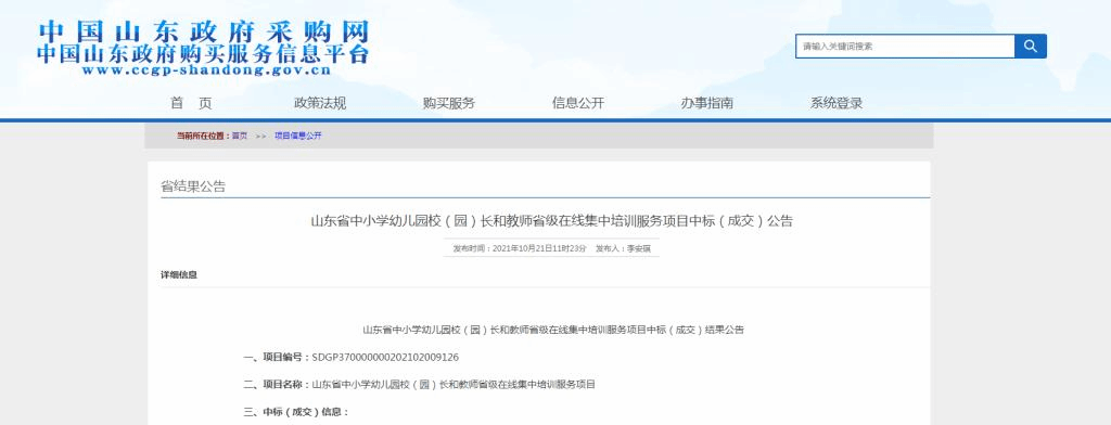 10月21日,山东省政府采购信息平台发布《山东省中小学幼儿园校(园)长和教师省级在线集中培训服务项目中标(成交)公告》,包括我校在内的北京大学、浙江大学、东北师范大学、哈尔滨工业大学(威海)、华中师范大学、西南大学、山东师范大学、济南大学、齐鲁师范学院等多所省内外单位中标,其中,我校中标思政课骨干教师培训项目,项目成交总金额为129.4万元。