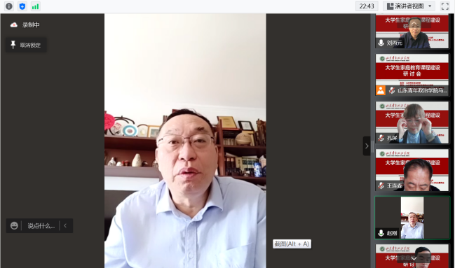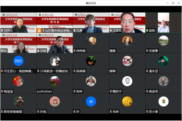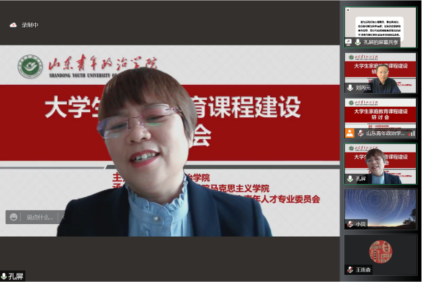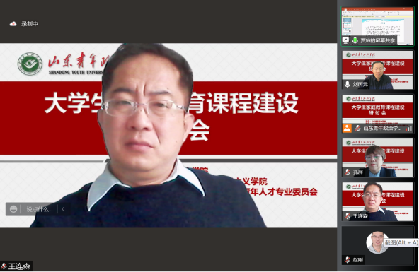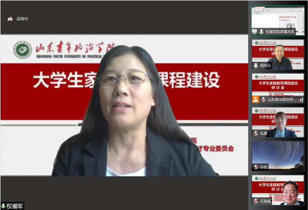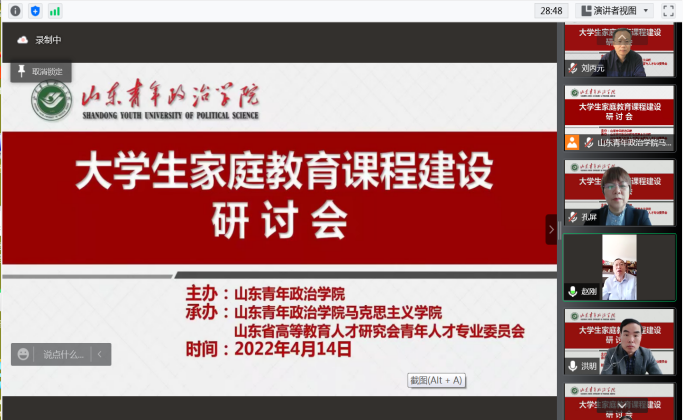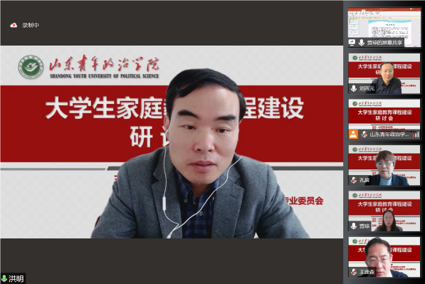 为了进一步学习贯彻习近平总书记关于注重家庭家教家风建设的重要论述,研究推动家庭教育研究成果如何进大学课堂,进课程体系,丰富和优化大思政课建设内容,更好地服务立德树人根本任务,更有效地促进大学生健康成长,4月14日,由山东青年政治学院主办的大学生家庭教育课程建设研讨会在云端举行,来自全国范围兄弟院校的专家学者及我校部分教师90余人参加了研讨会。研讨会由山东青年政治学院马克思主义学院和山东省高等教育人才研究会青年人才专委会具体承办。东北师范大学赵刚教授、中国青少年研究中心洪明研究员、聊城大学王连森教授、山东师范大学孔屏教授、山东青年政治学院权福军教授等六位专家应邀作主旨发言。我校党委副书记高峰全程参加了会议。研讨会由马克思主义学院院长刘丙元教授主持。