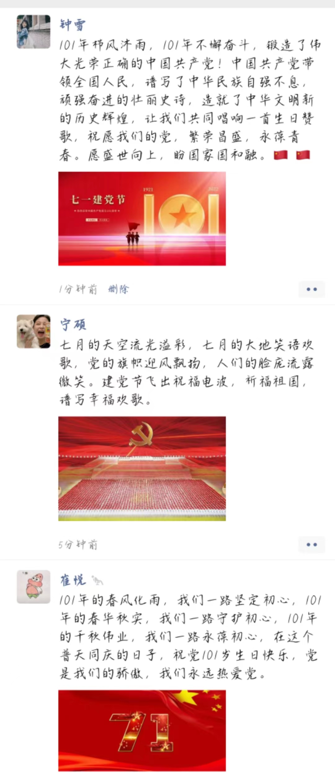 7月1日,马院学生纷纷“现身”朋友圈、抖音、快手、微博......通过文字、视频、照片、书法等方式表达党的生日的最真挚的祝福,“101年,初心如磐,使命在肩;新征程上,笃行不怠,砥砺前进!”、“致岁月铅华,敬红色传承,愿初心不改。”同学们的表白形式多样,内容丰富,气氛热烈,振奋人心,用实际行动感念党的丰功伟绩的同时,展示了马院人昂扬向上、积极奋进的精神风貌。