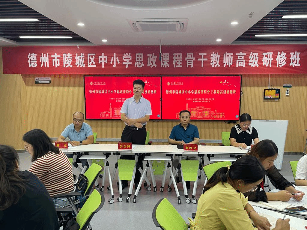 7月26日至7月30日,德州市陵城区首期中小学思政课程骨干教师高级研修班在我校举行。德州市陵城区教育和体育局党组成员吴金国,马克思主义学院院长刘丙元出席开班仪式,陵城区30余名思政课程骨干教师参加研修。研修期间,由高校知名课程与教学专家和中小学思政课优秀教师组成的授课团队为学员们提供了一场场思想盛宴和精彩案例,从新时代思政课如何改革创新、思政课教法创新、思政课教学话语创新与应用、教师的文化素养与思政课建设、青少年心理行为特征与教育等方面针对思政课教师的专业成长进行了深入交流与分享;学员们围绕思政课教学改革探索与实践进行了深入地研讨交流。