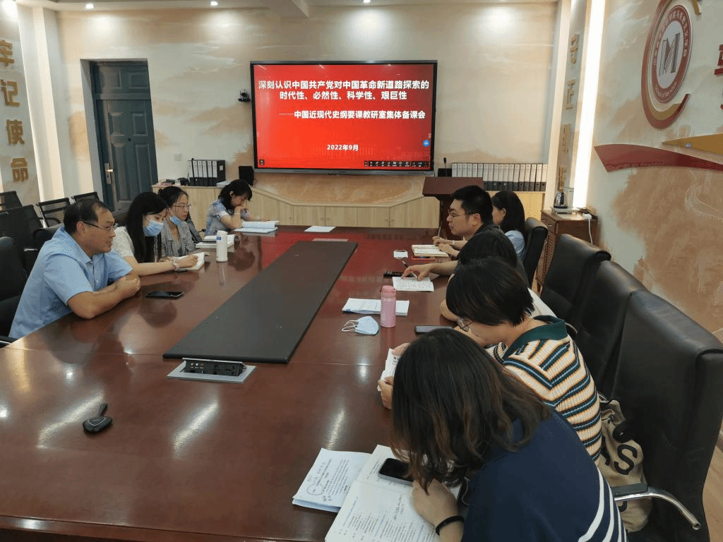为进一步深化思政课教学改革创新,切实提高思政课教师的教学能力和水平,增强思政课教师的大历史思维和国际视野,迎接党的二十大胜利召开,9月29日,马克思主义学院中国近现代史纲要教研室举行“深刻认识中国共产党对中国革命新道路探索的时代性、必然性、科学性、艰巨性”教学研讨会暨集体备课会。
