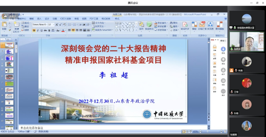为进一步提高教师学术科研水平,推动2023年课题申报工作,12月30日上午,马克思主义学院特邀中国地质大学(武汉)李祖超教授为全体教师作题为“深刻领会党的二十大精神 精准申报国家社科基金项目”的专题讲座,讲座由马克思主义学院院长刘丙元主持。