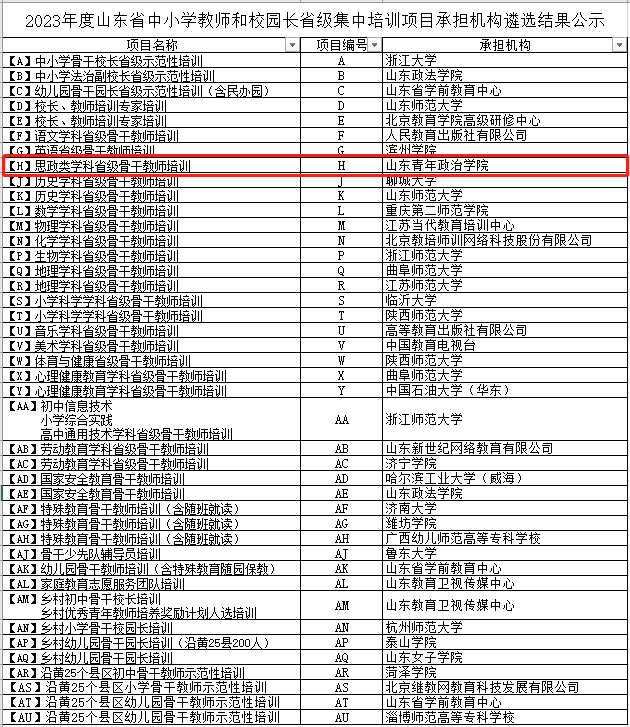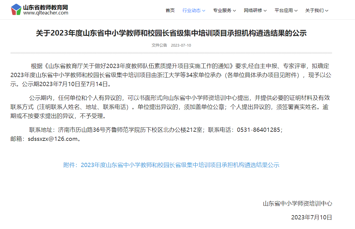 7月10日,山东省教师教育网发布《关于2023年度山东省中小学教师和校园长省级集中培训项目承担机构遴选结果的公示》,包括我校在内的浙江大学、中国石油大学(华东)、山东师范大学、哈尔滨工业大学(威海)、济南大学、齐鲁师范学院等34所省内外单位成功遴选为项目承办机构。其中,我校再次被遴选为思政类学科省级骨干教师培训项目承担机构,项目成交总金额为63万元。