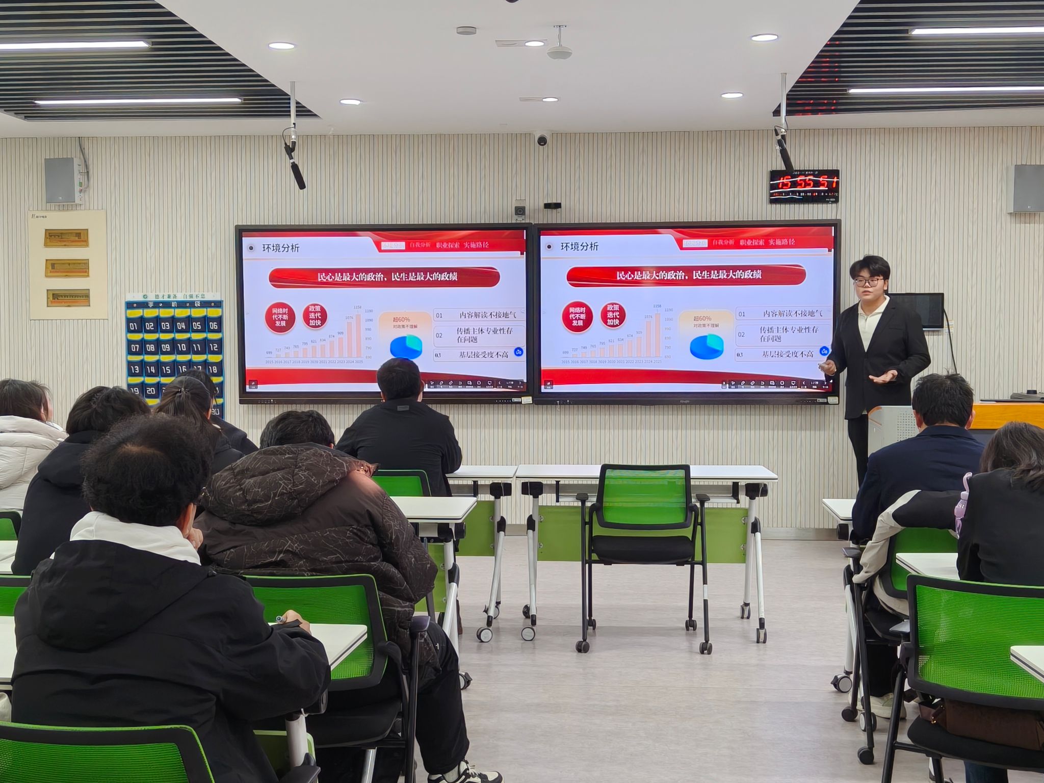 此次比赛设置成长与就业两个赛道,选手们聚焦自我认知、行业分析、目标设定、路径规划及风险评估等核心内容,通过主题陈述、现场答辩等形式展开精彩角逐。他们立足专业特长、紧扣行业趋势,从高校辅导员、党务工作者到时政编辑、思政课教师,展现了多元化的职业选择与新时代大学生的责任担当。评委们针对选手的表现做精准点评,从职业规划细节的可行性,考查其岗位认知的清晰度以及与专业和个人发展的适配度等角度做详细指导,增强选手对职业规划的理解深度。