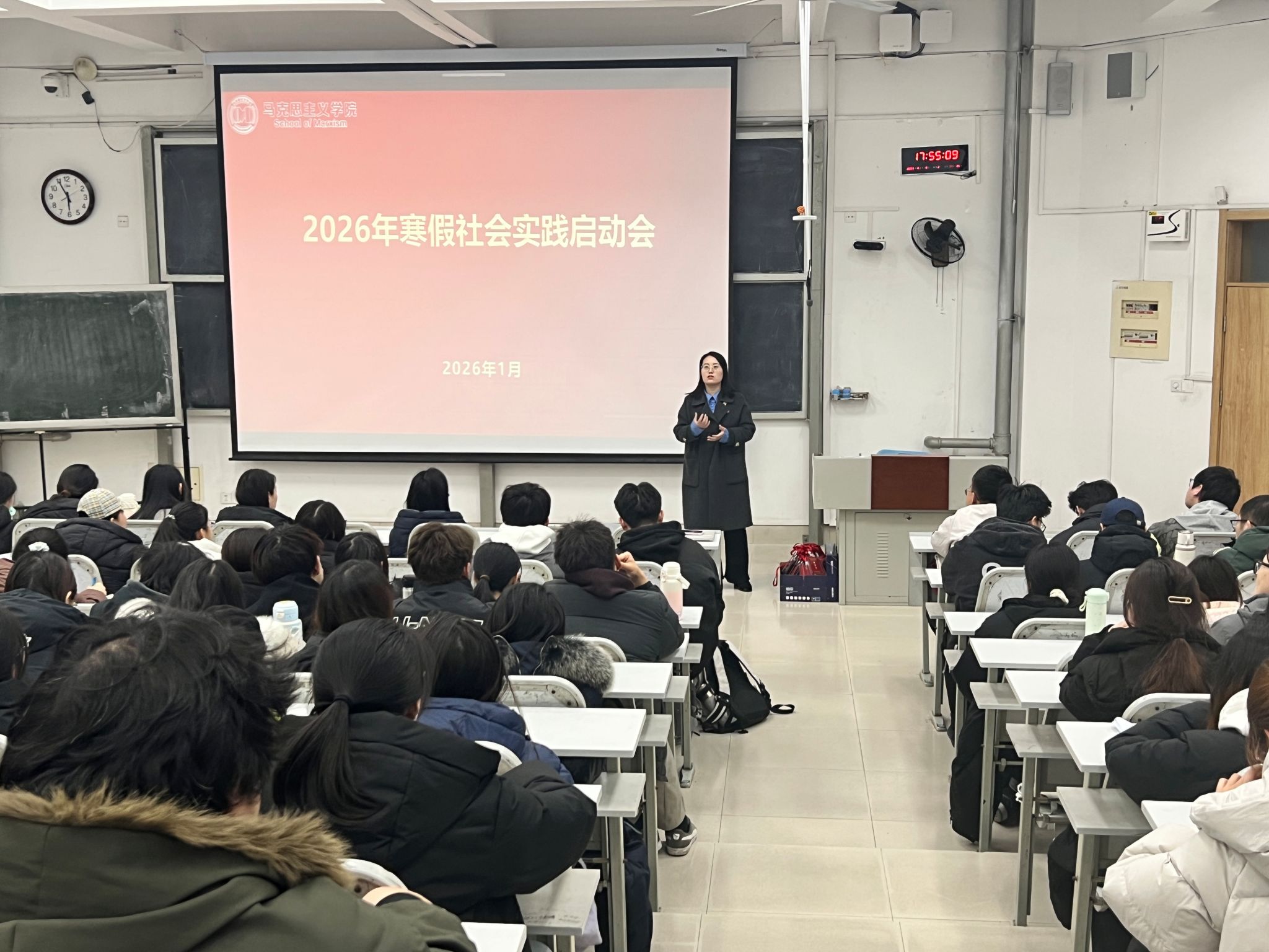 1月13日,马克思主义学院召开2026年“六个一”寒假社会实践启动会暨社会调研培训会。学院党委副书记夏晓丽、副院长魏晓娟、全体辅导员及在校生参加,学工办副主任、团总支副书记王雯雯主持。