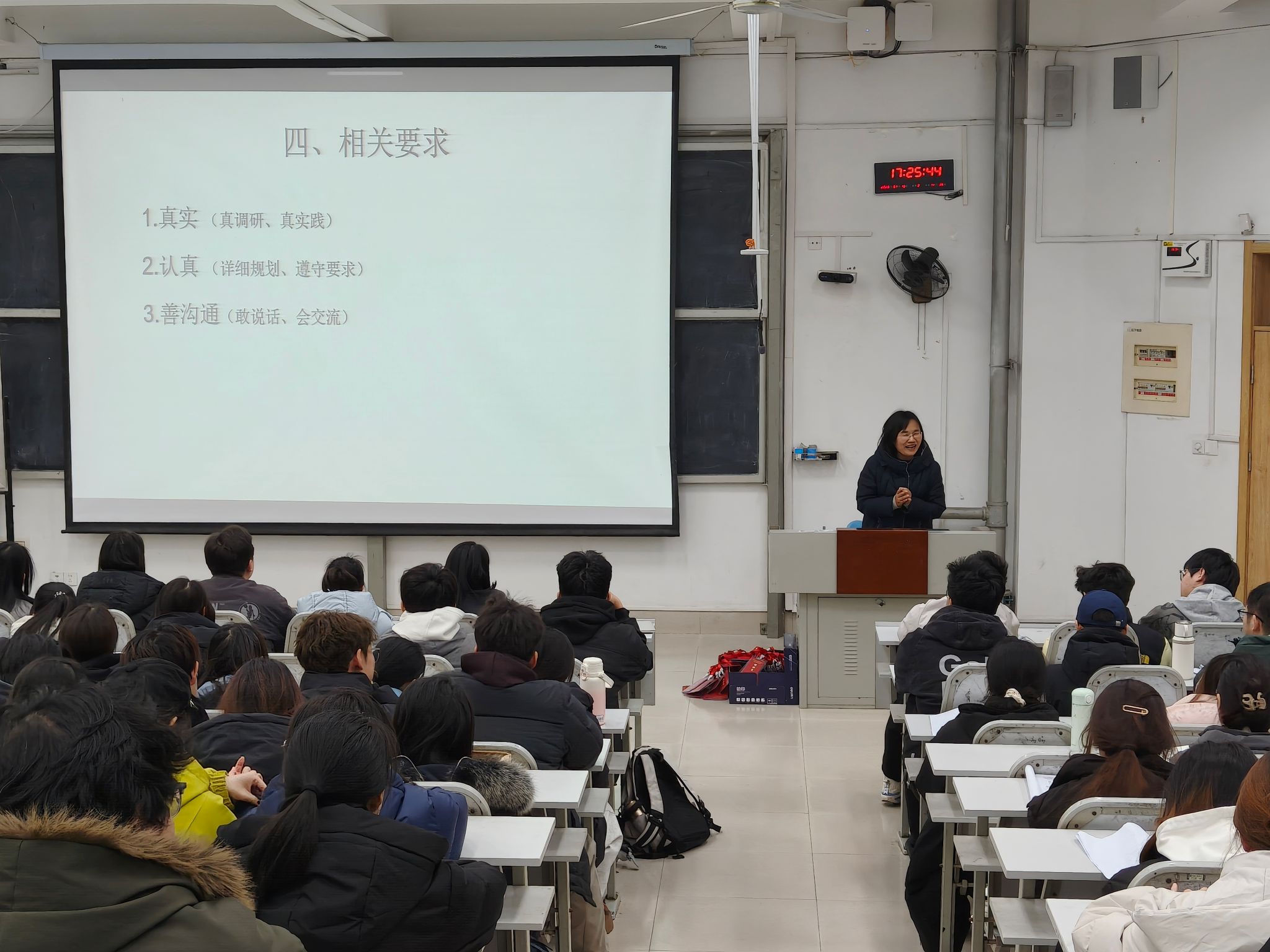 夏晓丽对全体同学发出动员,并提出三点要求:一是提高思想认识,主动投身实践。社会实践是理论转化为能力的“练兵场”,号召同学们以学院“六个一”实践要求为抓手,走出“象牙塔”,在基层实践中受教育、长才干、作贡献。二是坚守务实原则,确保调研实效。要求秉持实事求是态度,真正“沉下心、扑下身”,杜绝走马观花,用脚步丈量大地,用真心感知社情,让调研成果经得起检验。三是严守安全底线,绷紧安全之弦。她叮嘱同学们务必强化安全防范意识,遵守实践纪律与属地要求,确保“平安离校、安全返校”,为寒假社会实践圆满收官筑牢基础。