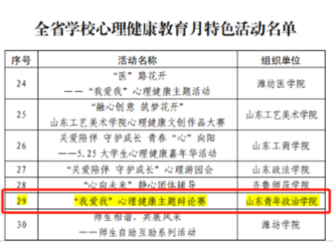 近日,2023年全省学校心理健康教育月活动评选结果揭晓,马克思主义学院“‘我爱我’心理健康主题辩论赛”入选全省学校心理健康教育月特色活动。