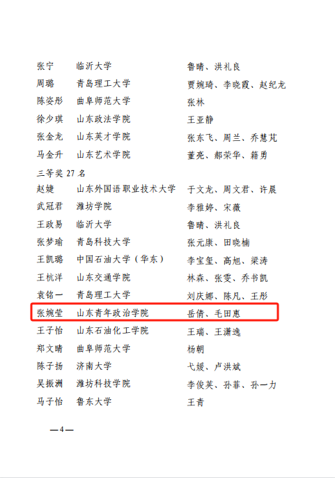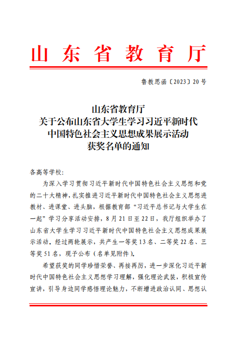 近日,山东省教育厅公布了2023年度山东省大学生学习习近平新时代中国特色社会主义思想成果展示活动评选结果,我校马克思主义学院思想政治教育专业2021级1班张婉莹同学《跟着总书记的足迹领略中华文化新气象》汇报展示荣获三等奖。