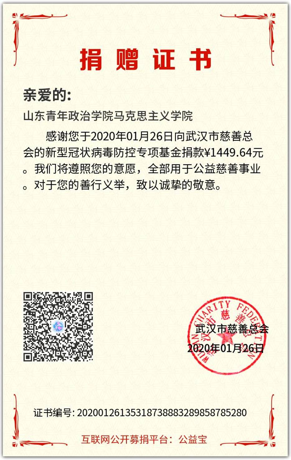 近期,新型冠状病毒肺炎疫情举国关注,牵动人心。为支援疫情严重地区,与武汉人民共渡难关,2020125日至26日,马克思主义学院19级思政1班发起爱心倡议,对武汉疫区开展爱心捐款活动。