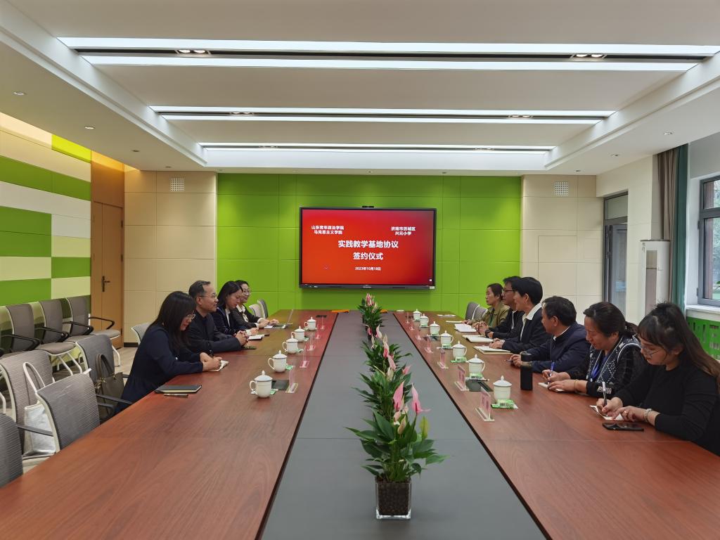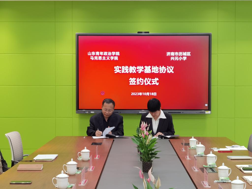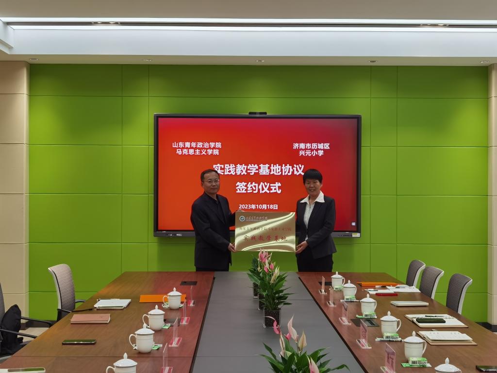 为提升人才培养质量,加强学生实践能力的培养,推动产学研及大中小学思政一体化深度融合,打造实践育人广阔平台,10月18日,马克思主义学院与历城区兴元小学举行实践教学基地签约挂牌仪式。仪式由兴元小学校长任兰英主持,山东青年政治学院马克思主义学院院长刘丙元、副院长段微晓、教科办主任魏晓娟、学生工作办公室负责人王雯雯参加仪式。