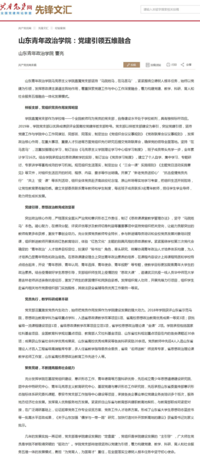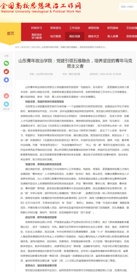 《守正创新“五维融合” 党建引领提升铸魂育人实效——山东青年政治学院马克思主义学院党委》入选教育部高校党建“一融双高”典型案例